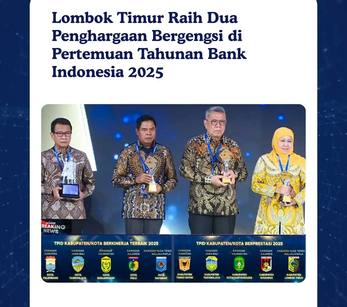 Bupati Lotim H. Haerul Warisin menerima penghargaan TPID untuk Kategori Kabupaten/Kota Berprestasi di Wilayah Nusa Tenggara, Maluku, dan Papua